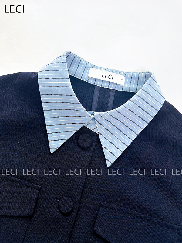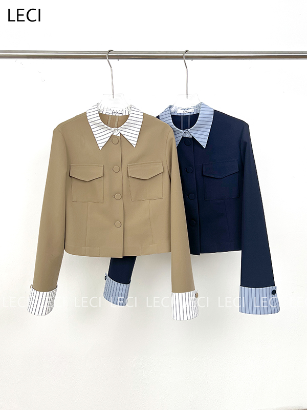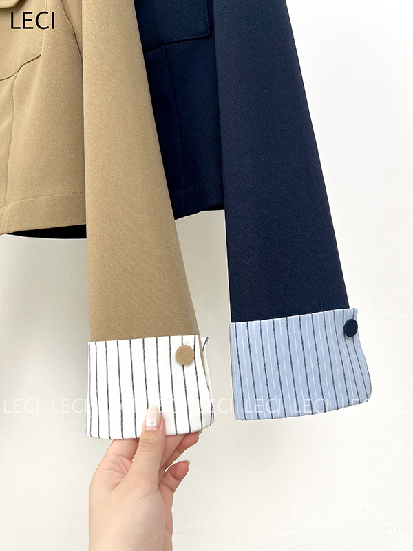 - Tay dài lơ vê ( xẻ V) phối vải thô kẻ cài 2 cúc bọc bẹt 1,5cm